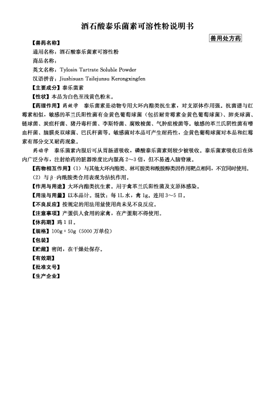 用于治療豬、雞革蘭氏陽(yáng)性菌、陰性菌引起的大腸埃希菌病、沙門(mén)氏菌病、巴氏桿菌病以及支原體引起的呼吸道疾病。