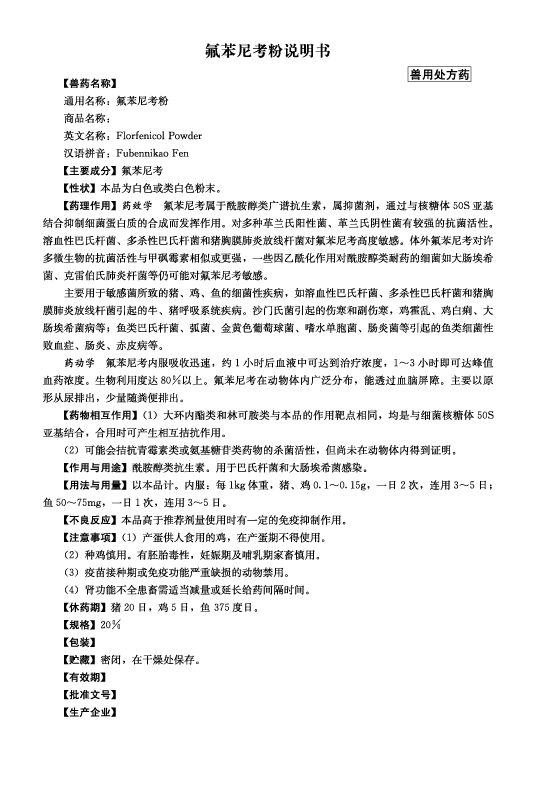 用于巴氏桿菌和大腸桿菌所致的細菌性疾病。